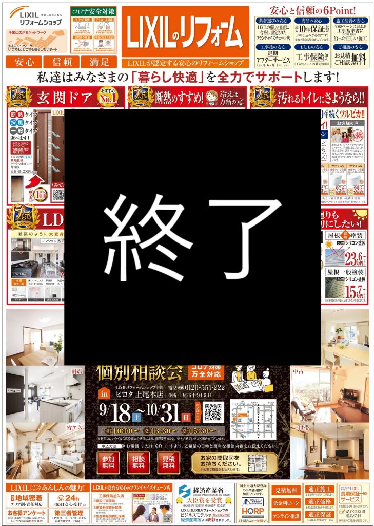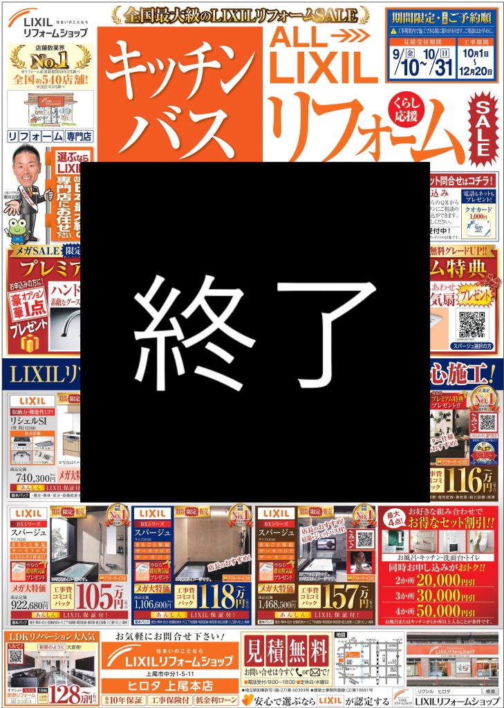 秋限定のメガSALE! 開催期間 2021年9月10日(金)~10月31日(日) チラシ詳細情報 【キッチン】・【バス】・【洗面】・【トイレ】は暮らしの中心! ★ちょうど!リフォームをしたかった方には必見です★ 【お得なセット割り】なんと!最大5万円引き!! リフォーム2点で2万円引き リフォーム3点で3万円引き リフォーム4点で5万円引き