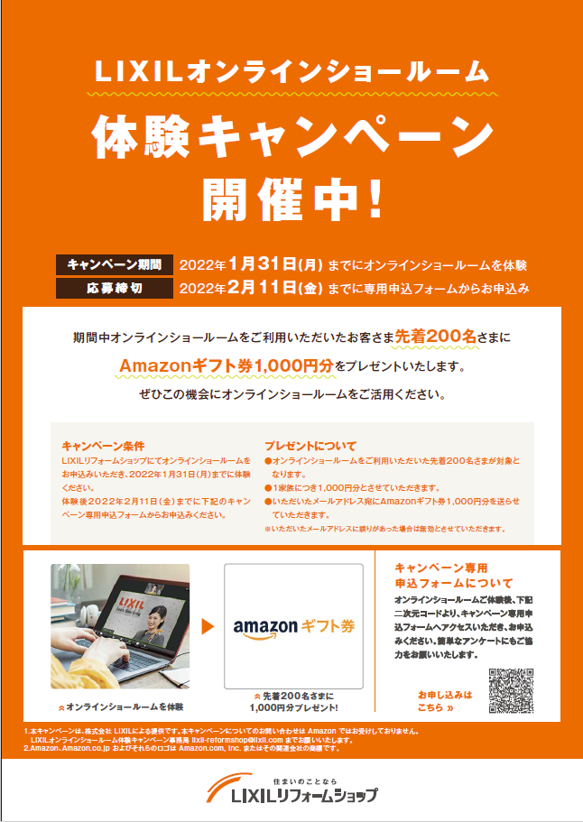 LIXILリフォームショップにてオンラインショールームをお申込みいただき、2022年1月31日(月)までに体験ください。体験後2022年2月11日(金)までにキャンペーン専用申込フォームからお申込みください。