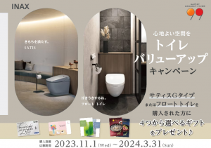 LIXILバリューアップキャンペーン:キッチン・トイレ 開催期間 2023年11月1日~2024年3月31日 イベント概要 リシェルSI・ノクト バリューアップキャンペーン 発注期間:2023/11/1~2024/3/29 今なら、リフォームでワークトップをお得にグレードアップ ↓詳しくはこちらから トイレ バリューアップキャンペーン 応募期間: 2023/11/1~2024/3/29サティスGタイプまたはフロートトイレを購入された方に 4つから選べるギフトををプレプレゼゼンント♪ ↓詳しくはこちらから