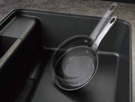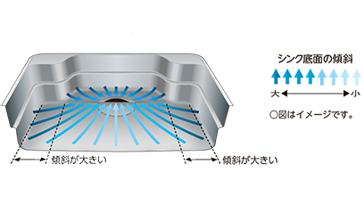 底面の傾きが左右の両端に行くほど大きくなる新形状。水が広がりにくく段差へ向かってスムーズに流れるためシンク内のどこからでも効率よく排水できます。