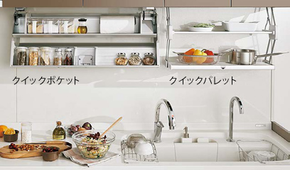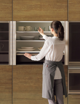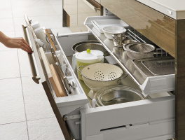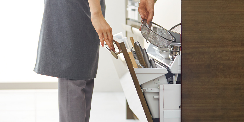 ほしい道具が最小限の動きで取り出せ、軽く開いてたっぷりしまえるらくパッと収納。「ヒューマン・フィット・テクノロジー」から生まれたキッチン収納が、作業をやさしくサポートします。
