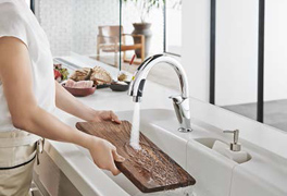 吐水口に内蔵されたセンサーが物や手の位置と動きを感知して、吐水も止水も自動で行います。シンク作業がラクになって、節水もできる水栓です。