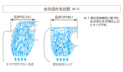 ナイアガラフロー方式は、従来シンクに比べて水流が広がりにくく、水が直線的に流れます。