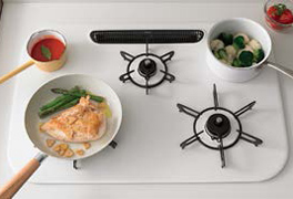 バーナー間隔を広げ、奥には仮置きのできるスペースも設けました。