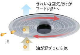 汚れの原因になる油分を入り口でブロック。オイルスマッシャー機構がフード内への油の浸入を抑えるから、面倒だったファンのお掃除が不要になりました。