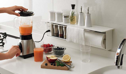 出したままになりがちな調味料などの小物を「ハンディボックス」にまとめて収納。便利なコンセント付きです。