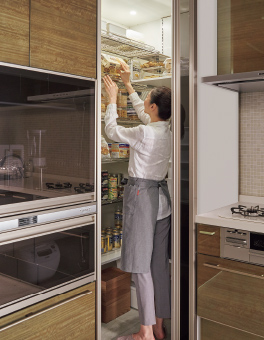 インテリアとして空間に美しく収まりながら、使いやすさを高める工夫を凝らした大型収納。取り出しやすさも抜群で、調理中の動作もスムーズにしてくれます。