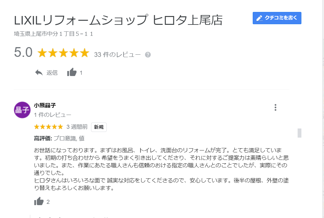 新しい口コミ、星5つ★★★★★をGoogleにいただきました!