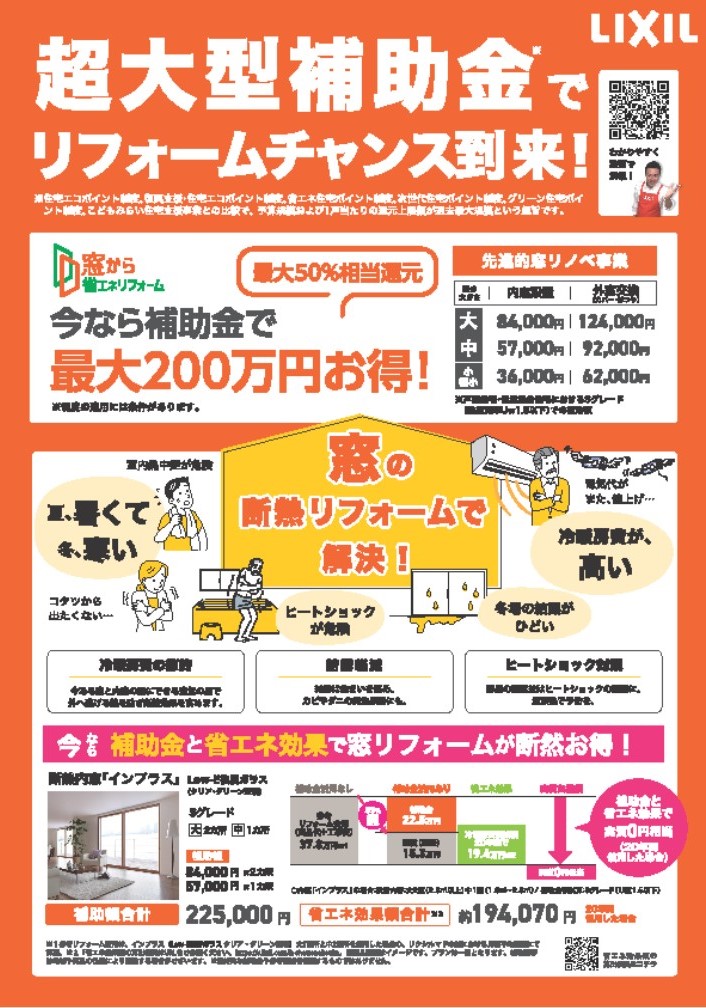 工事費用の一部を国が補助、50%~最大70%の補助が期待でき,昨今の光熱費の価格高騰への対応冷暖房費負担の軽減が可能です。