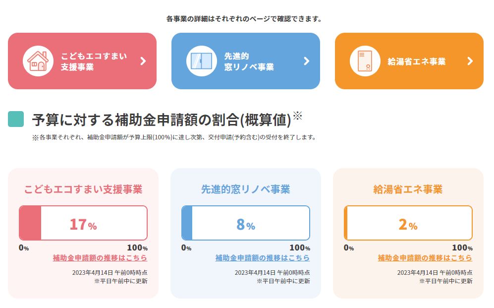 こどもエコ住まい支援事業・先進的窓リノベ事業:申請状況 2023年3月末から、住宅省エネキャンペーンの申請受付が始まっております。 4/14本日時点での、申請状況はこちら。 ・こどもエコ住まい支援事業:17% ・先進的窓リノベ事業:8% ご興味のある方はお気軽に無料相談をお申込みください。 【お問い合わせ】☝【来店で相談予約】☝