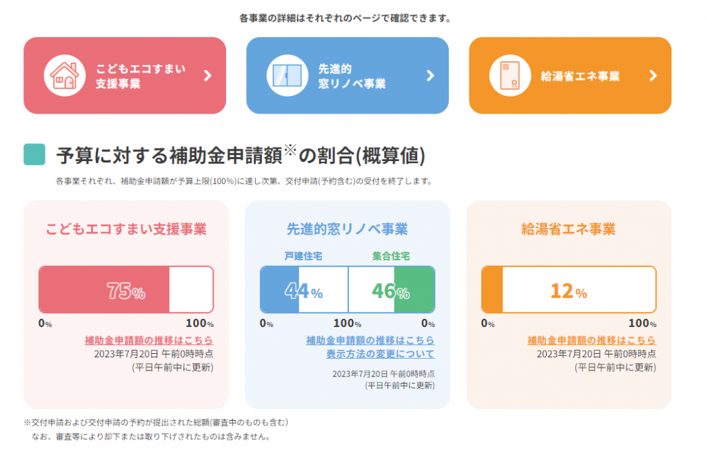 こどもエコ住まい支援事業・先進的窓リノベ事業:申請状況 2023年3月末から 受け付けている 住宅省エネキャンペーンの申請状況をお知らせします。 2023年7月19日 午前0時時点 ・こどもエコ住まい支援事業:75% ・先進的窓リノベ事業:戸建住宅44%・集合住宅45% ・給湯省エネ事業:12% ご興味のある方はお気軽に無料相談をお申込みください。 【お問い合わせ】☝【来店で相談予約】☝